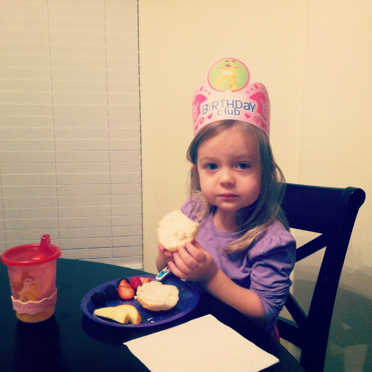 After an epicly long birthday nap, Daddy arrived home from work early{yay!}, and we let her choose dinner. She requested breakfast for dinner, so that’s what we did! Biscuits, bacon, scrambled eggs, and fruit. Complete with a princess crown.