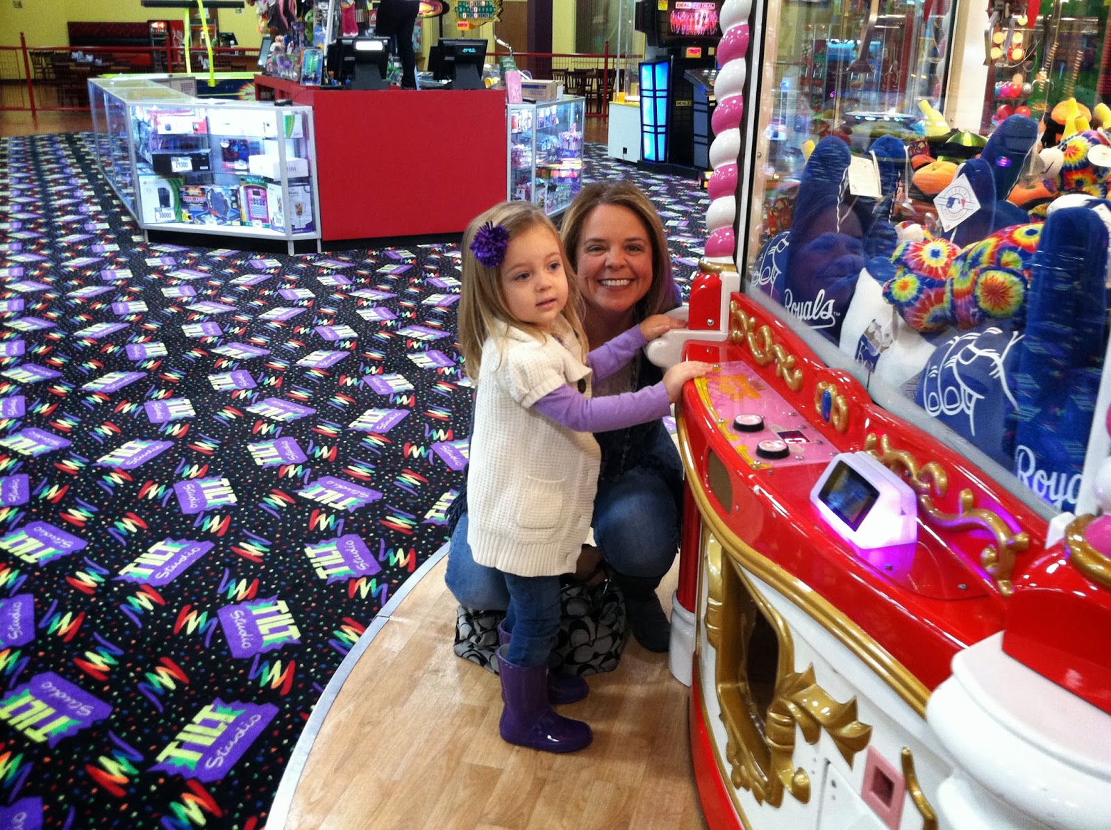 After a ride on the mall “merry go round” {it’s like a mini merry go round, with only 3 seat options. And it costs an entire dollar to ride. So, it’s like a 3 year old miracle to get to ride it} we walked the entire mall to get to the arcade to ride……