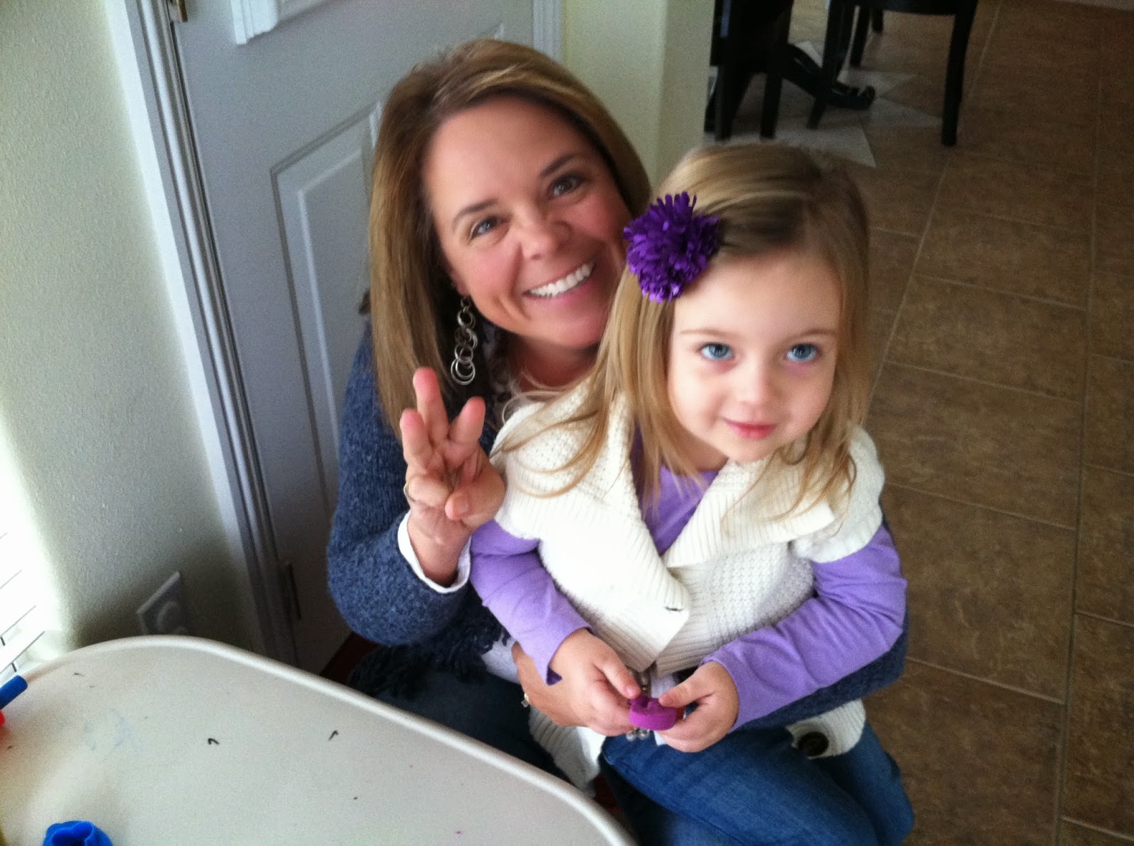 We were ready to head out for errands! But, first! We must show off how old we are. Abigail is holding a purple playdoh 3 that she cut out. Grammy is just being generally awesome.
