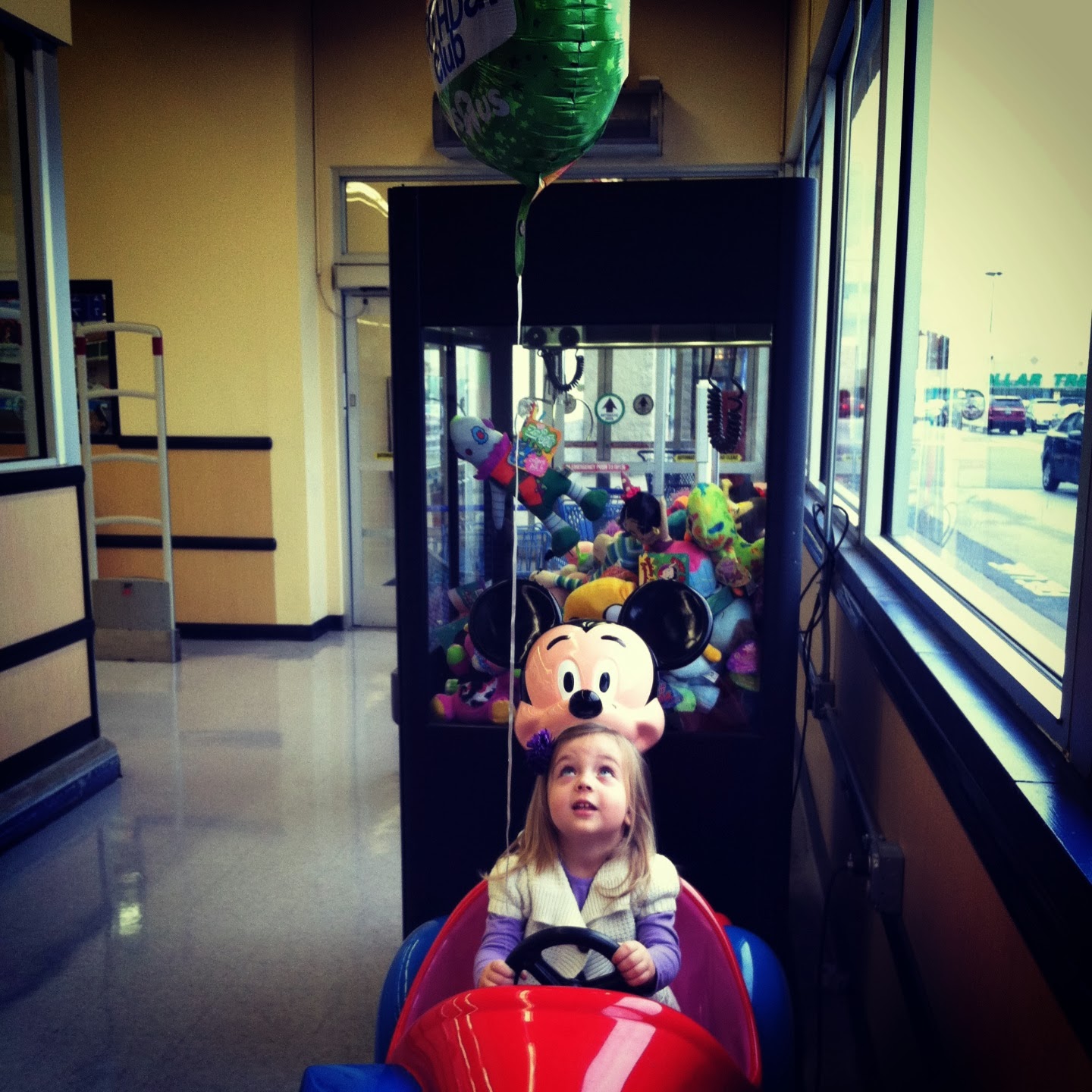 After the mall we headed over to the trusty Toys R Us to look for purple playdoh and purple paint{she has used up all the purple craft products in our house. Big surprise, I know}Â We struck out with that, but we did come home with some purple ornaments for her tree and she got to ride the mickey car holding her free TRU balloon.
