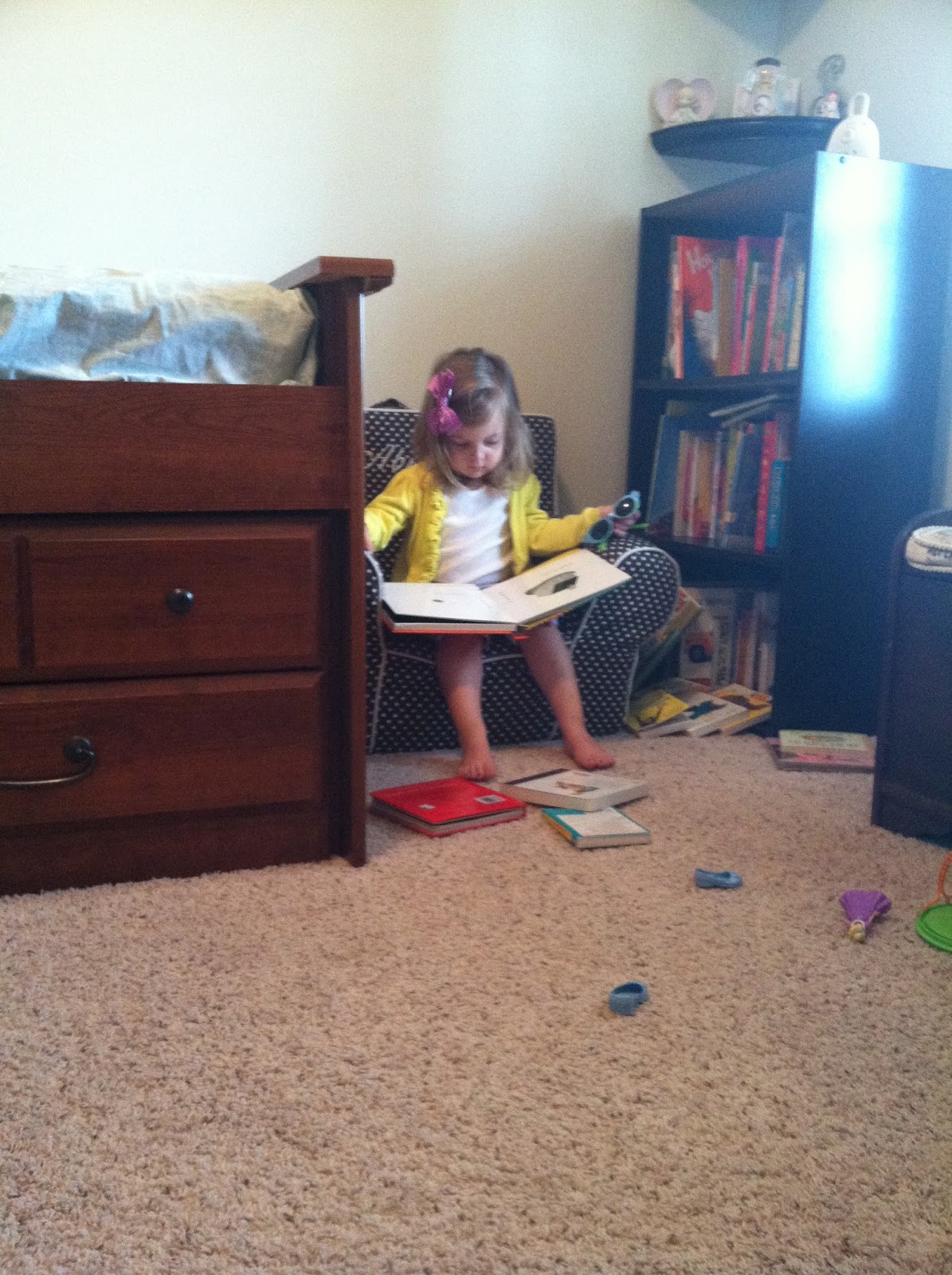 Abigail has taken to needing her “sunglasses” to be able to read her books. You can see them there in her hand. Crazy girl.